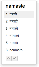 ഒരു ലിപ്യന്തരണം ഉപയോഗിക്കുമ്പോൾ, പദം ലാറ്റിൻ പ്രതീകങ്ങളിലെ സ്വരസൂചകമായി ടൈപ്പുചെയ്യുക. നിങ്ങൾ ടൈപ്പുചെയ്യുന്നതിനനുസരിച്ച്, സ്വരസൂചക അക്ഷരവിന്യാസത്തിലേക്ക് മാപ്പുചെയ്യുന്ന പദ കാൻഡിഡേറ്റുകളുടെ ഒരു ലിസ്റ്റ് കാണും. ഇനിപ്പറയുന്ന പ്രവർത്തനങ്ങളിൽ ഏതെങ്കിലും നടപ്പിലാക്കുന്നതിലൂടെ ലിസ്റ്റിൽ നിന്നും നിങ്ങൾക്ക് ഒരു പദം തിരഞ്ഞെടുക്കാനാകും: